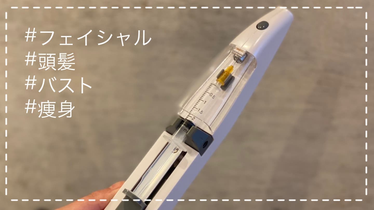 ⇒ シリンジの中に注射器が入っており、先を通すことで美容液を霧状に噴射します。直接、お客さまのお肌に針を使わないので注入後の凸凹や内出血などのリスクが無く、ダウンタイムもありません。
